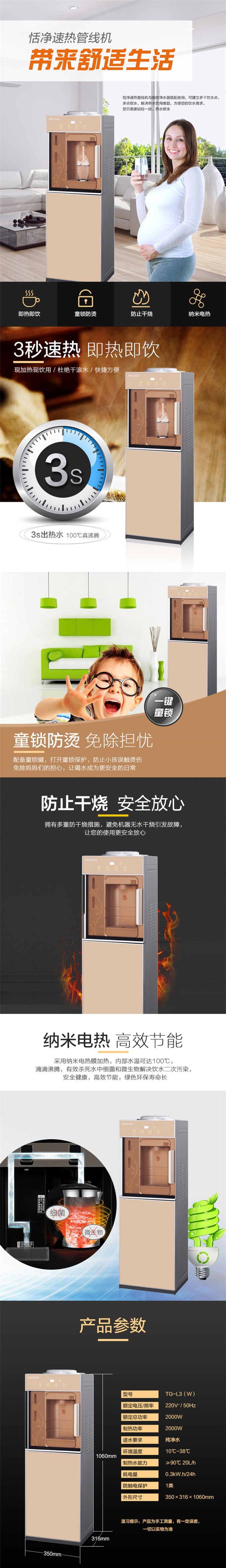恬凈速熱管線飲水機TG-L3(W),采用納米電熱膜加熱技術(shù),有效殺死水中的細(xì)菌微生物,防治二次污染。3秒速熱,隨時可喝上熱水。恬凈速熱管線飲水機TG-L3(W)自帶防干燒系統(tǒng)與童鎖,安全省心。